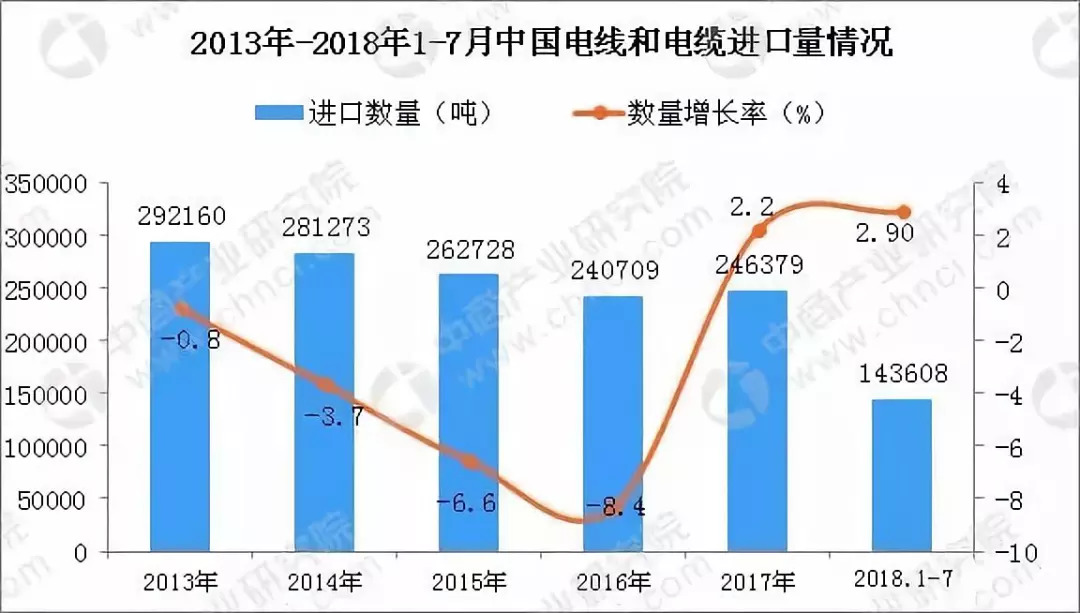 2018年1-7月中国电线和电缆进口数量及金额增长率情况入下图所示: